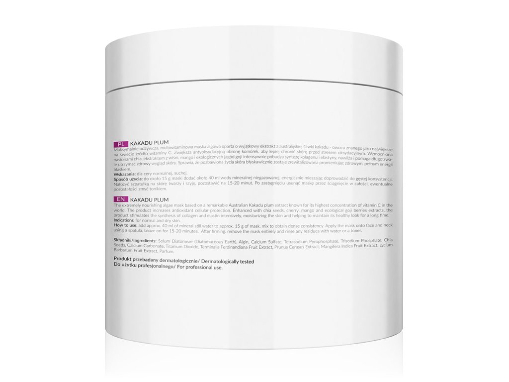 Alginátová maska se švestkami s chia semínky je perfektním řešením pro suchou a citlivou pleť. Zvyšuje antioxidační ochranu buněk. Díky velké dávce vitaminu C posiluje stěny cév a vyrovnává tón pleti. Revitalizuje pleť, rozzáří zářivost a zdravý vzhled. Další výhodou je krásná vůně.