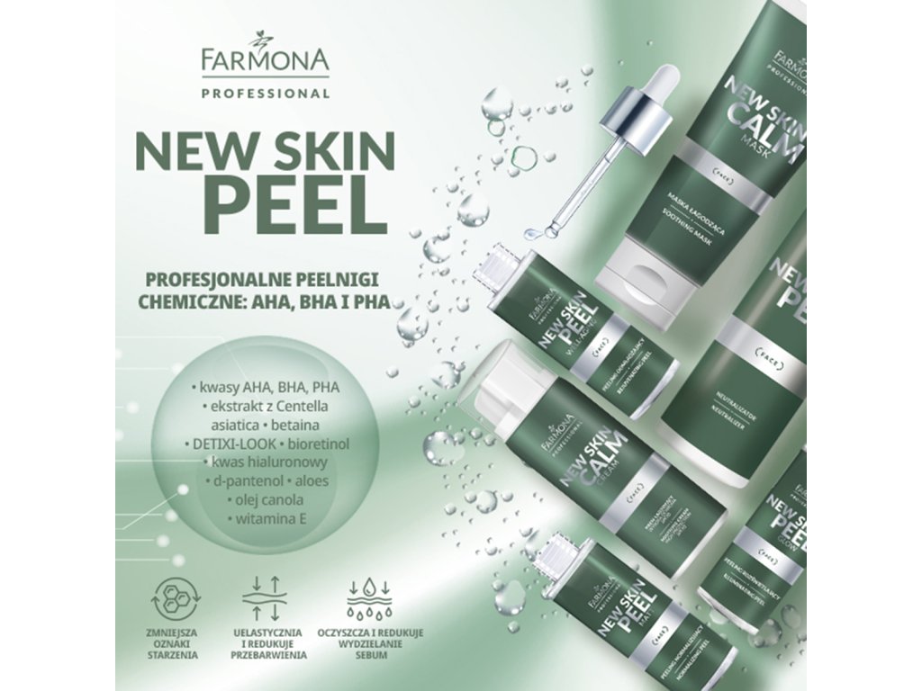 Řada NEW SKIN PEEL od Farmona Professional je unikátní kosmetické ošetření na bázi kyselin. Rozmanitost produktů umožňuje dokonalý výběr léčebné terapie, která vyhovuje potřebám pleti. Jedinečná kombinace AHA, BHA a PHA kyselin zlepšuje stav stárnoucí pleti, pleti se zabarvením, akné, viditelnými jizvami, šedou a suchou pokožkou. Zklidňující maska a krém SPF50 dokonale doplňují ošetření, zklidňují podráždění, podporují regeneraci pokožky a poskytují jí vysokou ochranu.