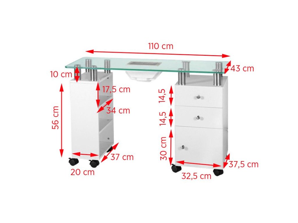 Tento stůl je nejen funkční, ale také mimořádně elegantní, dokonale se hodí k vybavení moderních salónů. Kromě tří otevřených polic má skříňku a dvě prostorné zásuvky a pohlcovač prachu. Díky osmi kolečkům je nábytek stabilní a snadno se přemisťuje po místnostech, i když je naložený. Díky několikacentimetrovému nárůstu pod deskou stolu ze silného tvrzeného skla je navržený stůl ideální pro provádění manikúry.
