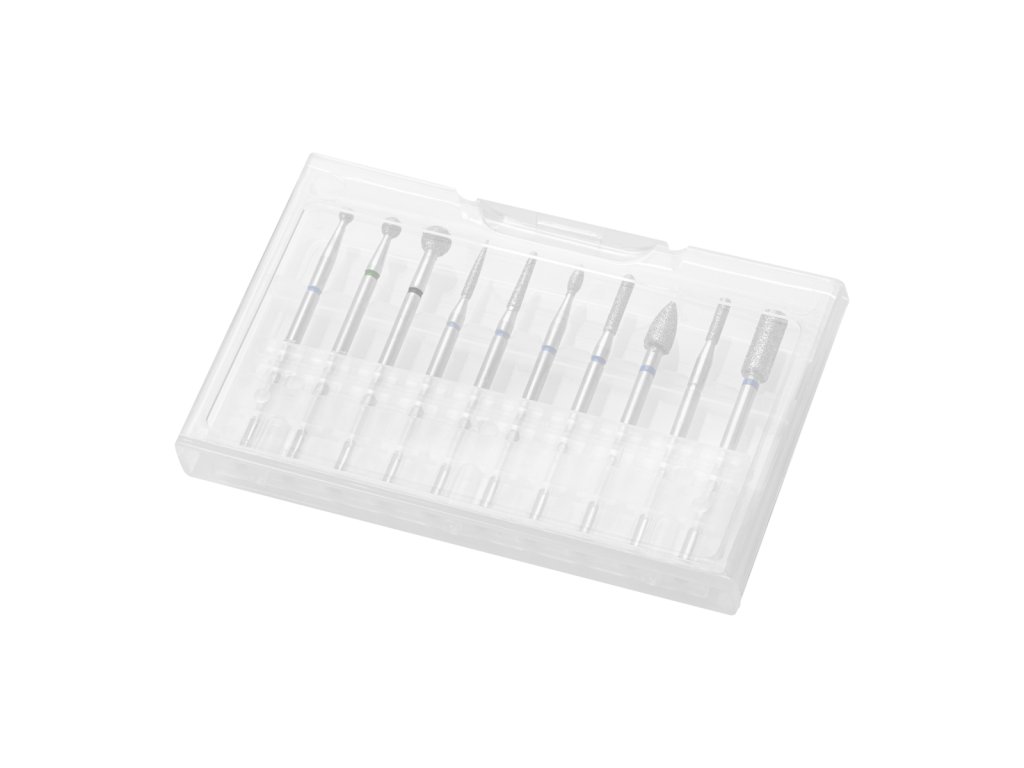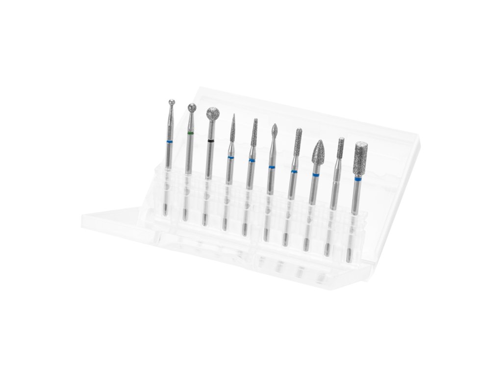 Sada diamantových fréz obsahuje 10 kusů precizně zpracovaných nástrojů určených pro profesionální manikúru i pedikúru. Diamantový povrch zajišťuje vysokou odolnost a přesnost při práci s přírodními i umělými nehty. Frézy jsou ideální pro úpravu kůžičky, tvarování nehtů i jemné dokončovací práce.