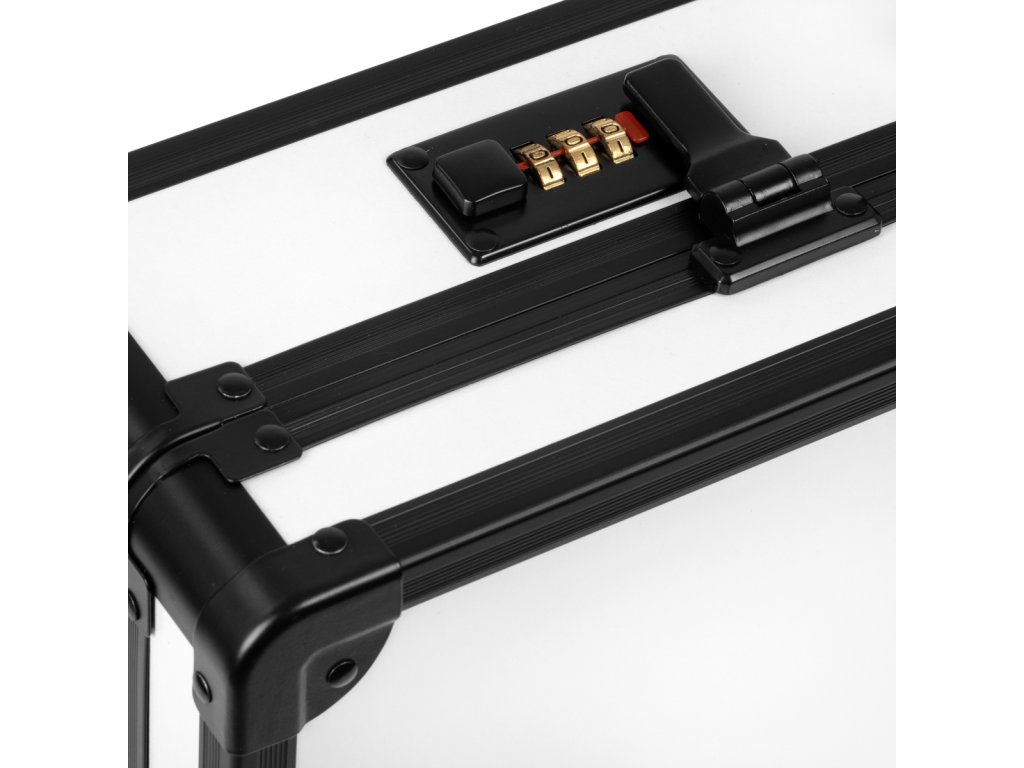 Aluminiowa walizka fryzjerska z podwójnym zamkiem szyfrowym i wygodnym uchwytem. Walizka pomieści różne akcesoria i narzędzia fryzjerskie - nożyczki, grzebienie, szczotki do włosów, suszarkę, maszynki do strzyżenia itp. Do walizki dołączony jest odpinany pasek na ramię.