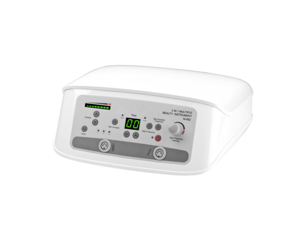 Zařízení Elegante 882 kombinuje dvě kosmetické technologie v jednom přístroji: ultrazvukový peeling (Skin Scrub) a darsonvalizaci. Ultrazvukový peeling šetrně odstraňuje odumřelé kožní buňky, čistí póry a stimuluje regeneraci pokožky. Darsonvalizace pak podporuje mikrocirkulaci, působí antibakteriálně a zklidňuje podrážděnou pleť. Tento kombinovaný přístroj je ideální pro profesionální kosmetická studia i domácí péči, kdy umožňuje komplexní ošetření pleti a zlepšení jejího vzhledu.